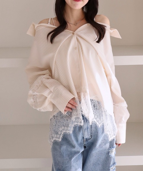 ■レースで魅せる、2wayオフショルシャツ■ 【デザイン】 ・袖と裾に施した繊細なレースが、女性らしさを引き立てるシャツ ・肩紐付きで、オフショルとしても着られる2way仕様 ・レース×オフショルのデザインで、甘さと抜け感を両立 ・ストライプ柄のシャツで、爽やかさのある印象に ・デニム合わせでもカジュアルになりすぎず、上品にまとまる一枚 【素材感】 ・軽やかなシャツ素材で、春夏にぴったりの着心地 ・さらっとした肌触りで、快適に着用可能 ・レース部分はやわらかく、肌当たりの良い質感 ーーーーーーーーーーーーーーー 透け感:レース部分にあり 裏地:なし 伸縮性:なし 光沢感:なし 生地厚さ:普通 洗濯方法:可(手洗い推奨) ※詳しいお手入れ方法は商品についているタグをご覧ください ーーーーーーーーーーーーーーー ※ご利用のモニター環境により、実際の色味と多少異なる場合がございます。 【スタイリング】 ・デニムと合わせて、抜け感のある大人カジュアルに ・ミニボトム合わせて、トレンドコーデに ・ティアードスカートと合わせて、フェミニンな春コーデにも◎ … information … 欲しいitemをお気に入り登録(♡マークをclick) ・お買いのがし対策…完売itemの再入荷やラスト1点の情報をお知らせ ・欲しいitemをお得にget…price downになったらいち早くお知らせ ・スムーズ検索…ZOZOのお気に入りアイテムページで簡単checkできるから、再検索不要♪