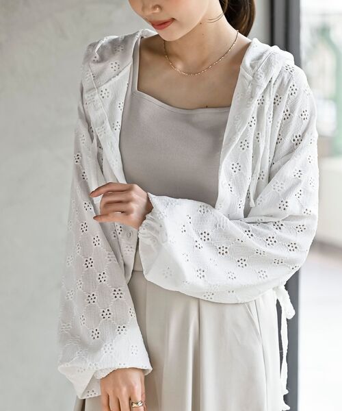 ☆2026/SS NEW☆ 軽やかにさっと羽織れるレースパーカー 上品でいて大人カジュアルな透かし編みレースパーカー。 清涼感のある透かし柄が春夏の装いにぴったりな1枚です。 袖口はゴムで絞って手元に抜け感をプラス。 たくし上げも簡単に決まります。 ハイウエストやボリュームのあるボトムスとも相性の良いショート丈。 裾サイドのリボンを絞ればシルエットの変化も可能。 1枚でも羽織としても使える便利な1枚です。 ジャケットのインナーに使ってフードをちら見せしてもおしゃれ◎。 裏地なし 伸縮性なし 薄手 前開きボタン留め ポケットなし 袖口ゴム仕様 裾ひも入り(調節可) 洗濯:洗濯機可(ネット使用) ▼お気に入り登録でお得がいっぱい▼ ~商品をお気に入り登録~ 再入荷・ラスト1点などの通知を受け取ることができます! ~ブランドをお気に入り登録~ 《rps》の新商品・再入荷情報をいち早くお届け!