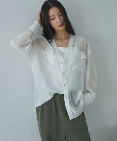 シアー感とVネックが抜け感を演出する大人シャツ! 【point】 ・顔周りや首周りがすっきり見える前後V開きデザイン ・ヒップ周りが隠れすっきり見える、やや長めな着丈も◎ ・薄手で軽やかな 楊柳素材は表面にシボ(凹凸)があるので肌に張りつき にくく、夏でも快適な着心地です ・トップスとしても羽織としても着用可能で着回し力も抜群です 【fabric】 ・多少のシワが気になりづらい楊柳特有の素材感 ・凹凸のある楊柳素材 透け感:あり 裏地:なし 伸縮性:なし 光沢感:なし 生地の厚さ:薄め 【注意事項】 ・画像の商品はサンプルです。 実際の商品と仕様、加工が若干異なる場合があります。 ・サイズ表記はあくまで目安となります。 ・取り扱いについては、商品についている品質表示でご確認ください。 ・照明の関係により、実際より明るく見える場合がございます。またパソコンなどの環境により、製品と画像のカラーが若干異なる場合がございますので、予めご了承くださいませ。 ■お気に入り登録がオススメです!■ 《商品のお気に入り登録》 カラー・サイズ選択の横の「♡」をクリックで簡単に登録できます 完売カラーの再入荷や在庫が1点になったとき、セールになったときに通知をお届けします 《ブランドのお気に入り登録》 ページ上部のブランド名の「♡ お気に入りブランドに追加」をクリックで簡単に登録できます 新商品の情報やイベントなどお得な情報をいち早くお届けします 是非、ご登録お願いします♪