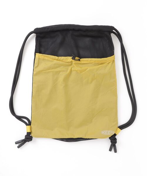 メッシュ素材とナイロン素材を組み合わせたナップサック・PUコーティング、リサイクルナイロン・フロントポケットナイロン100% メッシュポリステル100% ・H46xY37 15L 280g・ハリのあるメッシュ素材と太いコードショルダーで肩負担を軽減し、フロントポケットで収納分けができる、暑い季節に使いやすい便利なデザイン・W37cm/H46cmMESH NYLON KNAPSACK / 1032453(MANGO MINT)