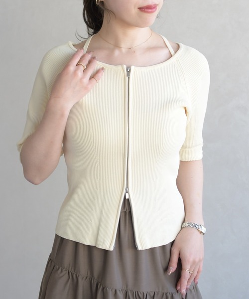 -*-*-*-2026 Spring&Summer Item-*-*-*- 抜け感を楽しむ、ホルターネックデザイン ジップで魅せる、今季らしいカジュアル感 ■ design デイリーに活躍するホルターネックニット。 身頃のジップとホルターネックデザインを組み合わせ、 程よくカジュアルさをプラスした一枚です。 上下にスライダーを配したダブルジップ仕様で、 下側からも開閉が可能。 アレンジ次第で、シルエットの変化もお楽しみいただけます。 ■ styling point 裾を少しだけ開けたアウトスタイルで、 抜け感のある着こなしがおすすめです。 レーススカートや花柄スカートなど、 甘さのあるボトムと合わせることで、今季らしいスタイリングに仕上がります。 ※ご覧のモニター環境や光の照射・角度により、 画像の色味と多少異なる場合がございます。 ご了承ください。 \《お気に入り登録》でお得な情報をGET/ 『♡』をクリックすると… ・《商品のお気に入り登録》で再入荷通知や ラスト1点の通知、セールやクーポンの通知も 受け取ることができます。 ・《ブランドのお気に入り登録》で新作商品や再入荷など、 お得な情報を受け取ることができます。