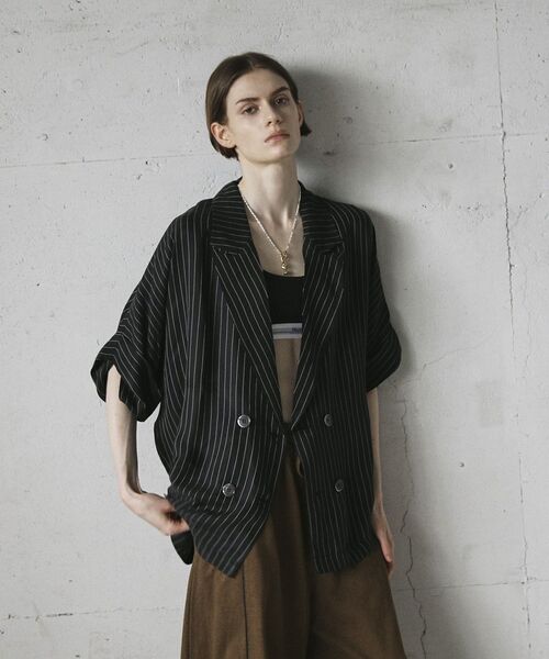 しっとりと肌触りの良いストライプ柄生地で仕立てた半袖ジャケット。ゆとりのあるサイズ感のドルマンシルエットでインナーを合わせてももたつかず、快適に着用していただけます。ダブルボタンがカジュアルになりすぎず、きちんとした印象もプラス。合わせ方次第で秋口まで活躍するおすすめのアイテムです。透け感[なし]生地の厚さ[普通]光沢感[ややあり]伸縮性[なし]裏地[なし]ポケット[あり]※モデル着用画像は、光の当たり具合で色味が違って見える場合がございます。※お使いのモニター環境によって商品の色味が違って見える場合がございます。▼ 気になった商品はお気に入り登録がおすすめ ▼商品ページ内の ♡ ハートマークをクリックしてお気に入り登録しておけば、 他アイテムとの比較やお値下げのチェックも楽に行えます!ぜひ、お買い物する際にご活用下さい。■GARAGE OF GOOD CLOTHING(ガレージ オブ グッド クロージング)ブランドコンセプトは「Whim woman~気まぐれな女性~」ハイブランドもデニムも、古着も、ベーシックもメンズだって着てみたい。そんな自由なファッションを楽しみたい女性の心を満たせるSHOPです。