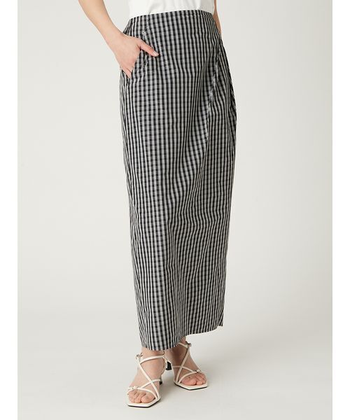 【斜めに入ったタックが、ドラマティックなアシメラインを作るモードなスカート】【Design/Styling】アシンメトリーなタックデザインで、立体感のあるシルエットを構築したスカート。斜めにタックを入れることで、すっきりとした流れが生まれ、タイトシルエットがモードな印象に進化しています。さまざまなトップスと相性がよく、シーンを選ばず使えるのもポイントです。カラーは3色をご用意。ヴィンテージテイストで速乾性があるオーガンジー素材のWHTとBLK、ハリのあるメモリータフタのCHECKで展開しています。※照明の関係により、実際よりも色味が違って見える場合があります。またパソコン・スマートフォンなどの環境により、若干製品と画像のカラーが異なる場合もございます。予めご了承ください。商品の色味は、商品単品画像をご参照下さい。 ※商品画像はサンプルのため、色味やサイズ等の仕様に変更がある場合がございますので、予めご了承ください。