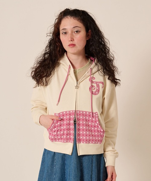 スタイリッシュなフロントジップ仕様のスタープリントパーカー。 フード裏、ポケット、Jロゴにはアクセントとなるスタープリント生地を使用し、デザイン性を高めています。 point ・程よい厚みの生地で、シーズン問わず着用しやすい ・前中心に隠しダブルジップファスナーを採用し、着脱がスムーズ。星型のスライダーはさりげないアクセントで、開閉時に可愛らしさと遊び心をプラス。 ・ポケット口にはフリルデザインで可愛らしさをプラス ・袖口と裾はリブ使用で、フィットしながらも快適な着心地を実現 透け感/なし 伸縮性/ややあり 裏地/なし 洗濯機可・ネット使用, タンブル乾燥不可, アイロン可・スチーム不可 <お届け時のシワにつきまして> ページで着用している商品は撮影前に全てプレスをかけております。(バッグ・小物等除く) その為お送りする商品は畳みジワや細かいシワがついている場合がございます。 <色移り・色落ちについてのご注意点> この商品は摩擦(特に湿った状態での摩擦)や汗や雨などでぬれた時は他の衣料や下着に色が移る事がありますので、十分ご注意ください。 <臭いについてのご注意点> 染料や加工を加えた際の臭いが製品に付着している場合がございます。 臭いが気になる場合には、風通しの良い日陰の場所で陰干しをしてください。 <写真・画像・カラーについて> 商品のカラーは撮影環境・視認性を考慮した色調整を行っておりますが、撮影条件やブラウザ、パソコンの環境により、実物と異なる事がございます。また、モデル画像・スナップ画像は撮影条件の影響を大きく受けやすくなっております。商品単体の画像をご参考にしていただくようお願いいたします。 <製品のお取り扱いについて> 取り扱いについては、商品についている品質表示に詳細を記載しております。必ずご確認ください。(一部商品除く) <洗濯について> お洗濯は商品についている洗濯絵表示に従って行ってください。(一部商品除く)