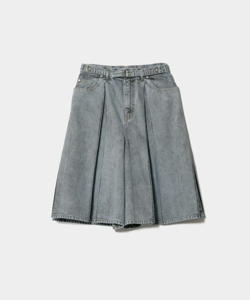 【デザインの特徴】 ・5ポケットディテールのスカートパンツ ・Aラインシルエット ・シンチバックル仕様のベルト付き ・ジャストフィット ・ローウエスト ・膝丈 【素材のこだわり】 ・定番の12オンスセルビッチデニム ・生地端の耳部分に織りで表現した赤と青のドビーステッチ ・ネームタグは牛革に防縮加工を施したものを使用 ・インディゴデニムにベージュウォッシュ加工 ・ブラックデニムにサックスウォッシュ加工