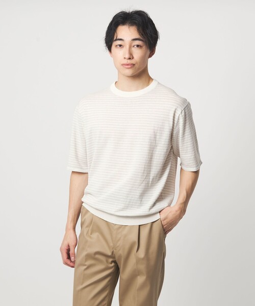 スタイリングに変化を加える大人ボーダーなニットT リネンの爽やかな素材感が春夏シーズンを爽やかに演出 ■デザイン ・適度なゆとりを加えたサイズ感の半袖ニット ・裾をリブ仕様にすることで丸みのあるシルエットに ・袖口はリブなし仕様ですっきりとした印象に ・柄は細めピッチ&落ち着いた色味で大人っぽい上品なボーダー ■素材 ・リネン×ポリエステルの糸を使用 ・リネン素材ならではのネップやふしがあり、春夏らしい清涼感が魅力 ■コーディネート ジャケットなどのインナーにぴったりです。 絶妙なボーダー柄が全体の雰囲気をほどよくカジュアルダウン。 スポーティなブルゾンなども相性がよく、上品さをプラスしてくれます。 暖かくなれば一枚着でも着用可能な、シーズン長く楽しめる一着。 ============================ 裏地:なし 透け感:なし(WHITE:ややあり) 光沢感:なし ケア方法:洗濯機洗い可 ============================ 【注意事項】 ※商品に「取り扱い上の注意書き」、「洗濯表示」がございます場合は、使用前に必ずご確認ください。 ※商品画像は、光の当たり具合やパソコンなどの閲覧環境により、実際の色味と異なって見える場合がございます。あらかじめご了承ください。 ※商品の色味の目安は、商品単体の画像をご参照ください。 ※画像の商品はサンプルです。 店舗へお問い合わせの際は、全国のgreen label relaxing各店舗まで下記の品名/品番をお申し付けください。 品名:LI/PE BOR C/N 品番:31181000005