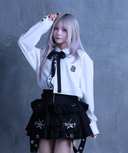 商品説明エンブレムワッペン刺繍とリボンディテールを組み合わせた、デザイン性の高いシャツ。胸元にはオリジナルのエンブレム刺繍を施し、シンプルな中にも程よい存在感をプラスしています。片側のみに配置したアシンメトリーなフラップデザインが、ベーシックなシャツにさりげない個性を加え、こなれた印象に。甘さのあるリボンディテールと、シャープな配色バランスがミックスされた一着です。付属のリボンは取り外し可能で、スタイリングに合わせて表情を変えられるのもポイント。モノトーン配色で、スカート・パンツ問わず幅広く着回せます。▷POINT胸元のエンブレムワッペン刺繍がアクセントアシンメトリーなフラップデザインで立体感をプラス取り外し可能なリボンでアレンジ自在モノトーンでコーディネートしやすい配色スカート・パンツどちらにも合わせやすい1枚着からレイヤードまで幅広く活躍 ▷STYLINGサスペンダー付きワイドパンツでモード寄りの着こなしにトリプルティアード裏毛スカートやフリルボトムと合わせてダークゴシックコーデ完結!男女のリンクコーデもおすすめです◎カラーホワイト、ブラック素材ポリエステルカテゴリトップス>シャツ商品番号82623503003サイズ身幅着丈袖丈肩幅FREE65cm前75cm、後80cm60cm52.5cm ---モデル詳細--- --- FABRIC --- 洗濯方法:手洗い可 透け感:ホワイトのみややあり 生地の厚さ:普通 --- ATTENTION --- ※撮影環境により、実際のカラー、形状、デザイン等多少異なる場合がございます。 ※製品によっては染料の特性上、湿った状態での長時間の放置、または摩擦により他のものへ色移りする恐れがありますので着用時にはご注意下さい。