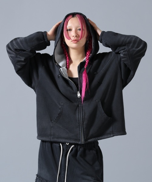 DankeSchon 硫化加工によるムラ感とラフなダメージ表情が特徴のジップフーディー。インナーにサーマル生地を組み合わせレイヤード前提で設計された一着。着込むほどに表情が増しヴィンテージライクな雰囲気を楽しめます。 POINT ・硫化加工による独特なフェード感・フード裏にサーマル生地を切り替えたレイヤード仕様・随所に入ったダメージ加工で無骨なアクセント・程よくルーズなシルエットでユニセックス対応 STYLE TIP インナーにプリントTやロング丈Tを合わせて、裾や首元のレイヤードを強調。同シリーズのスウェットパンツやデニムと合わせれば、統一感のあるスタイルに。ジップを開けて軽い羽織としても活躍します。 硫化加工×サーマル切り替えというDankeschonらしい“加工重視”の一着。ラフなのに計算されたレイヤード感でコーデの主役になります。 DankeSchon・・・DankeSchonとは、このブランドの核となるキーワード D digitaliyデジタル式 A Architect創造者 N neologism新表現 K kittenish悪ふざけ E engrossing心を奪う の頭文字を組み合わせたものにドイツ語のSchonを付け、ブランドの意図に賛同してくれる人達に感謝の意味を込め、「DankeSchon(ありがとうの意味)」としている。