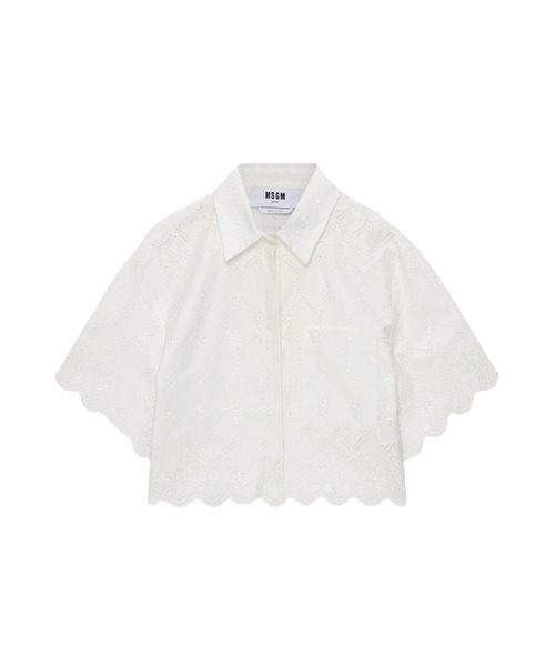 軽やかなポプリンにアイレットレースを組み合わせた、クロップド丈のショートスリーブシャツ。繊細なレースの抜け感とスカラップヘムのラインが、シルエットに柔らかなリズムを生むデザイン。コンパクトなクロップド丈がバランスよく決まり、ハイウエストのパンツやスカートとも相性抜群。シンプルなスタイリングに、クリーンでフェミニンなニュアンスを添える一枚。・レギュラーカラー・フライフロント・クロップド丈・スカラップヘム・ショートスリーブ・アイレットレースディテール(Sangallo Embroidery)・レギュラーフィット・カラー:オフホワイト・2026春夏 Collectionモデルサイズ:身長177cm バスト80cm ウエスト60cm ヒップ89cm着用サイズ:40
