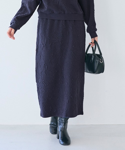 表情のある素材感が魅力のスウェットスカート■デザイン・シルエット膨れジャカードならではの立体感がポイント。ストンと落ちるシルエットで、カジュアルながら上品な印象。■素材・膨れジャカードのスウェット素材・程よい厚みでロングシーズン活躍■コーディネートシンプルなトップスと合わせるだけで着映え。スニーカーからきれいめシューズまで幅広く対応します。伸縮性:あり透け感:アイボリーややあり裏地:なしポケット:あり生地感:柔らかく伸縮性のある生地注意点:ネイビーは素材の特性上、色落ちしやすいのでご注意下さい。お洗濯方法によっては縮みや色あせの可能性あり。乾燥機等のご使用はお控え下さい。▼生地や素材の性質により2cm前後サイズ誤差が出る場合がございます。▼モデル着用写真は撮影環境により、多少実際のカラーと異なる場合がございます。▼色落ちの恐れがありますので、他のものと分けて洗って下さい。▼当商品は機械による生産の過程上、『生地を織る際の糸の継ぎ目』や多少の『ほつれ』、繊維の『混紡』、形やサイズに多少の『誤差』が生じる場合がございます。ボトムス スカート カジュアル 日常 着回し セットアップ可能 ウエストゴム リラックス スリット ポケット ロングスカート 26ss コカ COCA coca COCA coca
