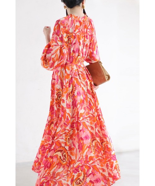 【CAWAII】 「エネルギッシュな色を纏うフラワーパターンロングワンピース(紐リボン付き)」 ■晴れやかな気分になる色鮮やかなカラー 目にした瞬間、心までぱっと明るくなる色鮮やかな配色が魅力の一枚。 華やかなピンクやオレンジを基調にしたアート感のあるプリントが、装いにポジティブなエネルギーを添えてくれます。 色数は多くてもトーンが美しく調和しているため派手になりすぎず、大人の女性が品よく楽しめる仕上がりに。 着るだけで気分が上向きになり、日常のお出かけから特別なシーンまで主役として活躍します。 ■エアリーにゆらめく軽やかな生地 空気を含むような軽やかな素材を使用し、歩くたびにふわりとエアリーに揺れるシルエットが印象的。 身体にまとわりつかず、自然な落ち感が女性らしい優雅な動きを演出します。 ロング丈でも重さを感じさせないため、春夏はもちろん、重ね着次第で季節の変わり目にも心地よく着用可能。 動くたびに表情が変わる生地感が、装いにドラマティックな余韻を残します。 ■ウエストマーク出来る紐付き 共布の紐付きデザインで、ウエストをきゅっとマークすればメリハリのあるシルエットに、 緩めればリラックス感のある着こなしにと、印象を自在に調整できます。 体型や気分に合わせてフィット感を変えられるため、着心地の良さとスタイルアップを同時に叶えてくれるのが嬉しいポイント。 前後どちらで結んでも表情が変わり、一着で着こなしの幅が広がる優秀なワンピースです。 【ショップのお気に入り登録】 新作アイテムやセール通知、お得な情報を受取ることができます。 ぜひご登録ください。 【商品のお気に入り登録】 気になるアイテムは《お気に入り登録》がオススメ! 入荷情報やクーポン情報、再入荷通知やラスト1点の通知などお得な情報を受け取ることができます。 ≪CAWAII(カワイイ)/ FRENCH PAVE(フレンチパヴェ)≫ 「他には無いカワイイが見つかる」「非日常を日常に」「自分の人生は自分で描こう」 をコンセプトに展開している芦屋発のレディースブランド。 流行にとらわれ過ぎない独自の世界観で、他にはないような個性的なアイテムを数多く取り揃えております。 10代、20代、30代、40代、50代の幅広い年齢層にご利用いただいております。 ※お使いのディスプレイにより色味が異なって見える場合がございます。