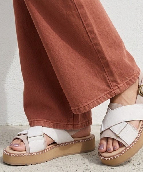 大人カジュアルを格上げ。本革仕様の厚底クロスストラップサンダル 洗練されたデザインと快適な履き心地を両立させた厚底サンダル。最大のこだわりは足裏のアーチに吸い付くようにフィットする立体的なフットベッド。ナッパレザーと高密度メモリーフォームを組み合わせることで包み込まれるような柔らかさと、長時間歩いても疲れにくいクッション性を実現しました。アッパーには上質なスエードを使用。クロスストラップのデザインが足をしっかりとホールドしつつ、程よい抜け感を演出します。程よいボリューム感の厚底ソールでスタイルアップを叶えながら軽やかな足取りをサポート。バックル付きのバックストラップでサイズ調整も自由自在。デイリーユースから旅行までこの夏手放せない一足に。 カラー展開は大人のエフォートレス・スタイルにピッタリな柔らかくヌーディーなトーンのベージュとブラックの2色。 ベージュは肌馴染みが良く足元を明るく見せ、女性らしい抜け感を演出します。 ナチュラルな素材感でまとめたコーディネートも◎! リネンワンピースや、エクリュカラーのワイドパンツやシアーシャツでまとめてきれいめカジュアルワントーンコーデも! もう1色は足元をキリッと引き締めるブラック。クールな印象でモードからカジュアルまで幅広く活躍します。 アンクル丈デニムと合わせたカジュアルスタイルにも。 フェミニンなスカートスタイルに併せて重めな足元にして少しクールに見せても! スエード素材なので春先や秋口にはソックスを合わせて、長い間楽しめます! 【EMU Australia/エミュ オーストラリア】 1994年よりスタートしたオーストラリアのオーシャンロードを起源とするEMUは最上級の自然素材に革新をブレンドし、“ever natural”をテーマに365日完全なる快適さをお届けするフットウェアブランドです。世界で一番履き心地の良い靴を目指して、常に開発し続けています。 天然素材を使用しておりますので商品1点1点に個体差がございます。小さな傷やシワ又 毛足の長さ等は、それぞれ風合い、質感によるものですので不良品ではございません。