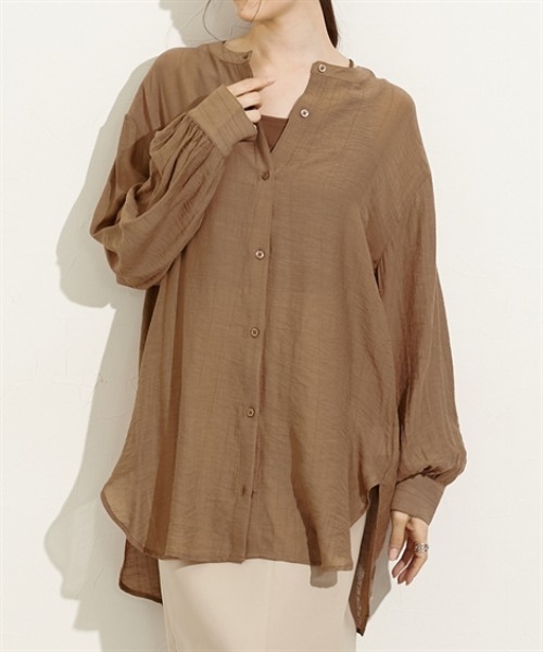 ■デザイン ゆるっとしたドロップショルダーがかわいいシャツが入荷しました。衿はバンドカラーで羽織としても使いやすいデザイン。袖のボリューム感もポイントです! ■素材 程よい透け感のシアー素材。透けすぎないのでオンオフ問わず着まわせます!ワッシャー生地で縦横に自然なしわ感のある加工をしてあるので洗いざらしでもしわがきになりにくく、お手入れ楽々。 ■おすすめのスタイリング シアー感があるので同色系のインナーを合わせると今年らしくておすすめです。後が長めでお尻が隠れる着丈なのでパンツにもスカートにも使いやすく、コーデの幅が広がるおすすめアイテムです! <仕様> レーヨン82%・ナイロン18% 前ボタン開き 透け感: あり 伸縮性:なし 生地の厚み:薄い 光沢感:なし 裏地:なし ポケット:なし 季節:秋 シルエット:ゆったり <洗濯方法> 手洗い ■キーワード 20代、30代、40代、きれいめカジュアル、きれかじ、オフィスカジュアル、キレカジ、シャツ、トップス、ファッション、ブラウス、レディース、大人、大人カジュアル、秋、通勤カジュアル、SL19SP109、はおり、ノーカラー、シアー