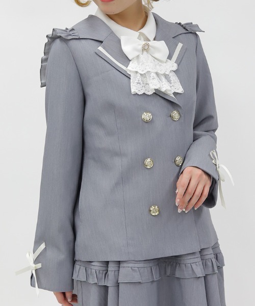 【アイテム説明】 POETIQUE School girl collection ⋆୨୧˚ 【商品紹介】 プレッピーなW釦&セーラー襟のジャケット 【デザイン】 配色感のあるエンブレム釦&リボンをあしらったジャケットです。 前から見るとテーラージャケットのようなシルエットで、後ろはセーラー衿が遊び心のあるデザイン。 フリル使いが程よくガーリーな印象をプラスします。 ややお尻にかかるくらいの丈感で、ボトムの丈を選ばず幅広く合わせていただけます。 【コーディネート】 ハイウエストフリルスカパン(TS211X45P)と合わせた、スクールガールのようなセットアップ風の着こなしがおすすめです。 ▽ axes femme POETIQUE * アクシーズファムポエティック 【Concept】 一編の詩のように紡がれる、 柔らかな色や優しいモチーフに心を弾ませて。 夢見る気持ちを忘れない、とっておきのクローゼット。 フリルやオリジナルプリントをあしらったガーリーなアイテムと デイリー使いにもおすすめのトレンド感もあるガーリーカジュアルなアイテムで 王道ガーリースタイルからミックスコーデまで様々な着こなしがお楽しみ頂けます。 ********************** .。.: お気に入り登録のおすすめ :.。. ∇気になるアイテムを登録∇ ハートをクリックしてお気に入りに登録すると 完売カラーの再入荷やラスト1点の通知、セールの通知を受けとることができます。 ∇ブランドを登録∇ 新商品や再入荷、セール通知など、いち早くブランドの情報を受けとることができます。 是非ご利用頂き、お買い物をお楽しみ下さい。 .。.: 商品について :.。. ・サイト上のカラー名と、お届け商品に記載されているカラー名が異なる場合がございます。 ・商品の色味は、撮影場所や光のあたり具合、お客様のお使いのPCのモニター環境などにより色味が違って見える場合がございます。 予めご了承の上ご注文下さい。 .。.: 返品・キャンセルについて :.。. ・着用、洗濯後の返品は致かねます。 ・商品到着後、着用前に商品を確認して頂きますようお願い致します。