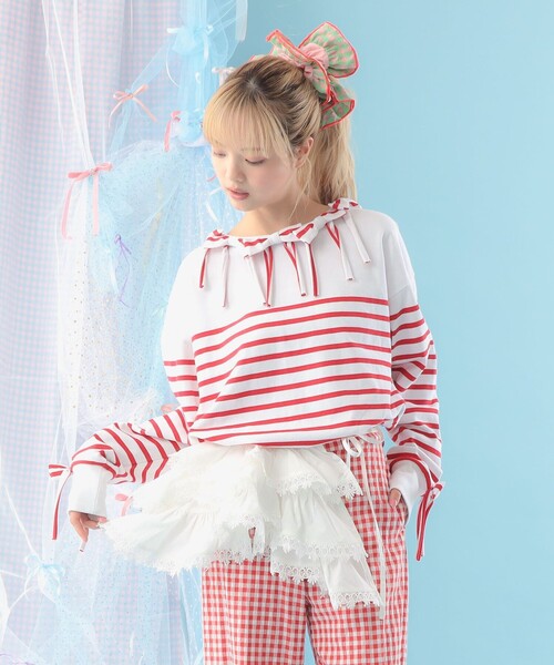 リボンを主役に魅せるボーダーカットソー ■デザイン ナバルボーダーに共地のリボンを贅沢にあしらったトップス。ネック周りや袖口の計算されたリボンがガーリーな存在感を放ちます。 ■コーディネート シンプルなボトムを合わせるだけで大人かわいいスタイルが完成。デニムなどに合わせたリボンを引き立てるカジュアルミックスがおすすめです。 ■サイズ リラックス感のある程よいサイズ ■素材 デイリーに着まわしやすいコットン素材。 RED Model : H163 B77 W60 H83 Size : ONE SIZE BLUE Model : H161.5 B76 W64 H88 Size : ONE SIZE 生地の厚さ:普通 透け感:なし 伸縮性:あり 光沢感:なし 裏地:なし ■ケア方法 水洗い・ドライクリーニング両方可 (詳細は商品についている品質表示ラベルをご覧ください) ※画像の商品はサンプルのため、実際の商品と「仕様」「色味」が異なる場合がございます。 CAROLINA GLASER / カロリナ グレイサー シンガーでありデザイナー、同世代の女性より多くの支持を集めるインフルエンサーでもあるMEGが手掛けるブランド。2014年12月より、BEAMSがプロデュースをスタート。スタンダードなアイテムにトレンドを取り入れて、今の気分をすぐ身につけられるウェアをオンラインショップで提案。