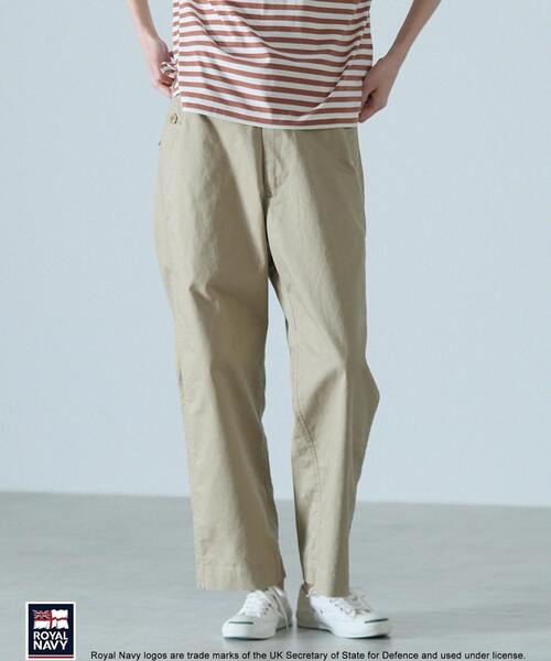 カジュアルな着こなしに活躍するコットンストレートパンツ。コットンツイルの無地とストライプ素材に洗いをかけた、程よくラフでこなれた表情に仕上げました。太すぎず細すぎないストレートシルエットで大人カジュアルなバランスの商品です。 【ROYAL NAVY】 アパレルでは類を見ない英国海軍から正規ライセンスを受けたブランド。 ミリタリーとファッションの関係は長く、定番的なアイテムの原型は実際に軍で使用していたものがベースとなって現在のファッションアイテムへと進化した物も多くあります。 膨大なビンテージアーカイブの中から当時のディティールを忠実に再現し、より現代風にアップデートし、枠にとらわれないハイブリッドな商品を展開しています。 ブランド名の「ROYAL NAVY」は英国の国防3軍の1つで、500年近くにも及ぶ長い歴史を誇る伝統的な部隊です。 ※画像の商品はサンプルです。実際の商品と色味、仕様、加工、サイズ、素材等が若干異なる場合がございます。
