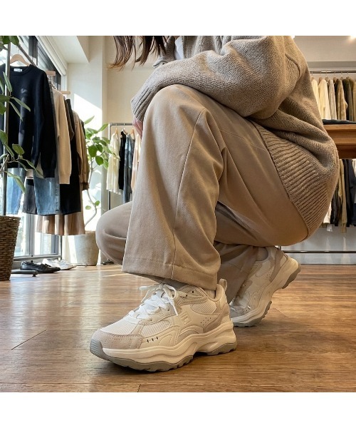 「足元重め」が今の気分。FILA『WAVY BLOCK』で叶える、最旬レトロムード。 今季のマストハブは、90sのランニングシューズを彷彿とさせるボリューミーなシルエット。FILAの新作『WAVY BLOCK』は、その名の通りウェーブ状のレイヤードデザインが特徴的。 絶妙なニュアンスカラーの「ベージュ」は大人っぽい抜け感を、差し色が効いた「ホワイト×パープル」「ホワイト×グリーン」はコーデの主役に。厚底ソールでスタイルアップも叶うから、ワイドパンツにもミニスカートにも相性抜群です。 「スニーカーはカジュアルすぎる」と思っている人にこそ履いてほしいのが、FILAの『WAVY BLOCK』。 複雑に重なり合うアッパーのデザインが、スポーティさの中にモードな奥行きを演出しています。特筆すべきは、このボリューム感からは想像できないほどの軽やかな履き心地。
