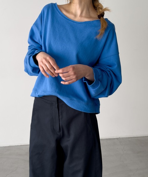 デザイン カットオフ仕様のネックラインがラフな抜け感を演出。 ワンショルダーやオフショルダーとしても着用でき、程よい肌見せで女性らしさをプラスします。 素材 裏毛素材なので、インナー次第でロングシーズン活躍してくれます。 コーディネート デニムと合わせたカジュアルスタイルはもちろん、綺麗めボトムとも相性◎ やや短めな丈感なので、ハイウエストのボトムを合わせるとバランスのいい着こなしに仕上がります。 El mar(エルマール) El mar はスペイン語で『海』 海に向かうときはだれでもワクワクする。 洋服を選ぶとき、袖を通すとき、 同じように心が踊るアイテムを提案したい。 そんな『ワクワク』な気持ちを込めて El mar はデビューしました。 ------------------------------------- 生地の厚さ:厚い〇〇●〇〇薄い 伸縮性:あり 透け感:なし 裏地:なし 光沢:なし ------------------------------------- 取扱い ・蛍光増白剤が入っていない洗剤をご使用ください。 ・クリーニングネットをご使用ください。 ・濃い色と白 ・淡色物は分けて洗ってください。 ・洗濯で多少縮むことがあります。洗濯後はすばやく形を整えて干してください。タンブラー乾燥はお避けください。 ・アイロンの際は当て布をご使用ください。 ・着用時の汗や摩擦により、他の衣類や鞄などに色移りすることがありますので、淡色系との着合わせはご注意ください。 ・摩擦や引っかけにご留意ください。 ※取り扱い及びお手入れ方法については、商品についている取扱表示、洗濯表示にてご確認下さい。 ※照明の関係により、実際よりも色味が違って見える場合があります。またパソコン・スマートフォンなどの環境により、若干製品と画像のカラーが異なる場合もございます。 ※商品の色味は、商品アップ画像をご参照ください。
