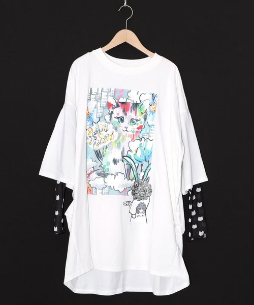 ■デザイン高層ビルなど都会的なモノトーン背景に、大きなネコちゃんを描きその周りをカラフルなお花やロゴで彩った、アート感たっぷりのチュニック。袖にソフトチュールを切り替えた、重ね着しているようなデザイン。発泡プリントの上から柄プリントを重ねた凹凸感ある仕上がりが特徴です。■素材本体にはしなやかで優しい風合いのカットソー生地を使用。袖は、ほどよく伸縮性のある柔らかなネコ柄ソフトチュールを切り替えました。直接肌に触れてもチクチクしにくい優しい生地感がポイントです。■コーディネート一枚で着るだけでレイヤード風スタイルが完成。シンプルなボトムスと合わせるだけでコーディネートが決まります♪※販売商品以外はモデル私物となります。品番:161634カラー:01(オフホワイト)09(ブラック)サイズ:M寸法:総丈約81-88cm/身幅約66cm/肩幅約64cm/袖丈(短)約27cm/袖丈(長)約46.5cm/重さ約380g素材:本体:綿100% ソフトチュール部分:ポリエステル95%・ポリウレタン5%MADE IN CHINAーーーーー裏地:なし透け感:やや透け感あり生地の厚さ:普通生地感:やわらかめ伸縮性:ややありポケット:ありーーーーー取り扱いのご注意※この製品は摩擦や水濡れにより色落ちにすることがありますのでご注意ください。※この製品は生地独特な風合いを出すために、製品加工してあります。(製品は1点、1点多少表情が違います)※この商品はデリケートな素材を使用しております。糸及び編組織の性質上、引っ掛け・引っ掛かりやすい為、着脱時や取り扱いにご注意下さい。ATTENTION※実測値のため、多少の誤差はご容赦ください。※商品カラーはできる限り再現するように心がけていますが、モニターやブラウザ等によって 実際の商品と差異が生じる場合がございます。あらかじめご了承くださいませ。【ScoLar】コーディネートの主役になれる服をコンセプトに、デザインはレトロな雰囲気を彷彿させる、独創的でインパクトのあるプリントが中心。幅広い年代にご利用頂けるゆったりとしたシルエット、ワクワク・ドキドキ感のあるカジュアルファッションを提案します。ーーーーーーーーーーーーーーーーーーーー★お気に入り登録について完売カラーの再入荷通知やお得な情報を受け取ることができます。★ブランドのお気に入り登録について新商品や再入荷などのお得な情報を受け取ることができます。