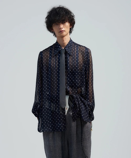 デザインシーズンテーマである"wink"が冠されたシアーシャツ。特徴的なドット柄とさりげなく佇むサテンのストライプ。絶妙なコントラストが奥行きを加え、ブランドらしい1枚に。生地はシボが特徴的な楊柳組織とサテン切り替えの軽やかなものを使用し、動きのあるシャツに仕上げた。引き続き、襟元のボタンで着脱・位置調整が可能なネクタイも付属。※ スリーブの内側にラバーバンドを取り付けています。腕を通して、袖の位置を調整いただけます。メーカー品番:26SS-B-BL02-BED J.W. FORD-2010年、山岸慎平(Shinpei Yamagishi)がブランド「ベッドフォード(BED J.W. FORD)」をスタート。"着飾る"をコンセプトに生活の中にある物事で美しさ、儚さを感じられる空間やモノ、音や映像をブランドの解釈で形を変え毎シーズンテーマを設けてコレクションを展開している。※店舗と在庫を共有しておりますので、受注確認メールが届いてもご注文のタイミングによりましては売り切れになる可能性がございますので、予めご了承ください。※商品の色味につきまして、撮影環境、お客様のお使いのPCのモニター環境により実際のカラーと画像の色味が違って見える場合が御座います。--------------------------------------------【お買い物をよりお楽しみいただく為に】▼商品のお気に入り登録をおすすめします。♡クリックしてください。完売カラーの再入荷や、ラスト1点の通知、セールの際の通知を受ける事ができます。ブランドのお気に入り登録もご一緒にお願い致します。