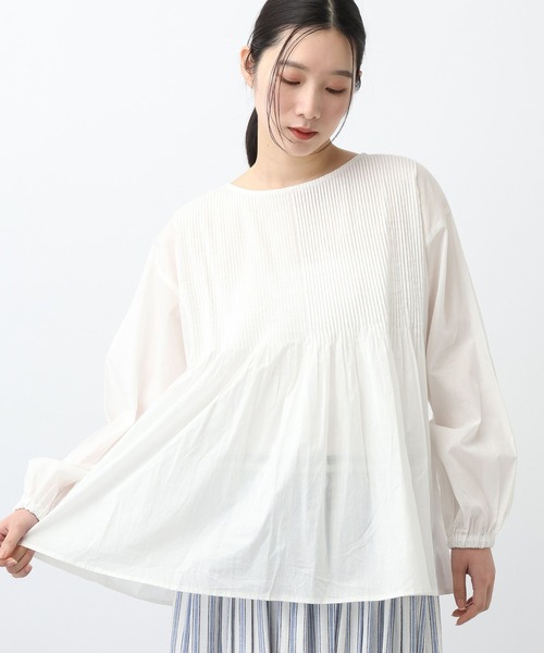 ボリューム感が大人可愛い一枚カジュアルにも綺麗目にも着こなせるブラウス</font></b>ーーー【素材】薄くて柔らかい肌触りの良いコットン生地を使用。着心地の良さも特徴です。【デザイン】春らしく素敵な印象のブラウス。前にたくさん入れた、細巾のピンタックがデザインポイントです。後ろはギャザーになっており分量感があるのも可愛いポイントになっています。ゆったりとボリュームの入ったお袖も◎ーーー【スタイリング】デニムやチノパンなどと合わせたカジュアルな着こなしや、綺麗めパンツと合わせた女性らしい着こなしもおすすめです。スウェットパンツやレースパンツなどと合わせても素敵に決まります。