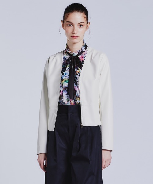 ノーカラーデザインですっきりと仕上げた、ミニマルな佇まいのフェイクレザーブルゾン。ストレスのない着心地で、長時間の着用でも快適さをキープします。カーディガンのように気軽に羽織れる軽やかさが魅力。エッジを効かせたコーディネートから、シックで大人らしいスタイルまで幅広く対応する一着です。 【お買い物を楽しみいただくためには】 ◆商品お気に入り登録 完売カラーの再入荷通知や、ラスト1点通知、セールの通知など受け取ることができます。 ◆ブランドお気に入り登録 新商品や再入荷など、いち早くブランドのお得な情報を受け取ることができます。