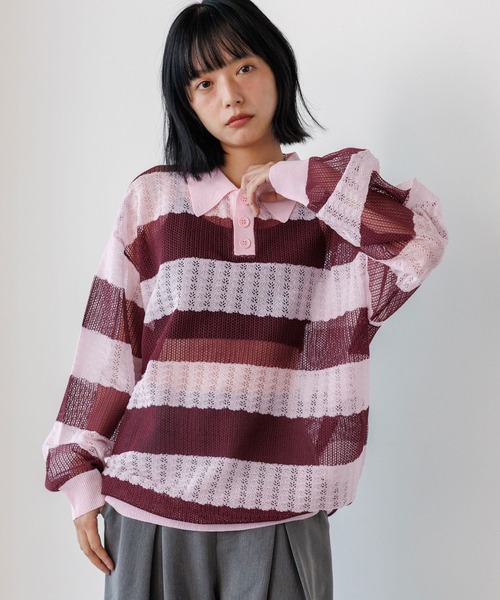 \シアー感トレンド感抜群ながメッシュニットポロ/ 太めのボーダーがカジュアルに1枚で決まるデザイン。 細やかなメッシュの編地が、上品でヘルシーな肌見せスタイルに。 キャミソールで女性らしく、Tシャツを重ねてストリートにと、インナー次第でコーデを楽しめます。 デニムやワイドパンツでカジュアルコーデはもちろん、スラックス合わせできれいめコーデもおすすめ。 ユニセックスで着用して頂けます。 〈注意事項〉 ・サンプルにて撮影をしておりますので、実際の商品とは素材や仕様・加工・サイズ等が若干異なる場合がございます。 ・モニター・環境等により実際の商品と色味が多少異なって表示される場合がございます。予めご了承をお願いいたします。 ・撮影環境により、光の当たり具合で色味が違って見える場合があります。あらかじめご了承下さい。 ▼気になるアイテムは《お気に入り登録》がおすすめです! 完売カラーの再入荷情報、セール情報、ラスト1点の通知を受け取ることができます! ▼《ブランドのお気に入り登録》で新商品や再入荷などのお得な情報をいち早くお知らせします。
