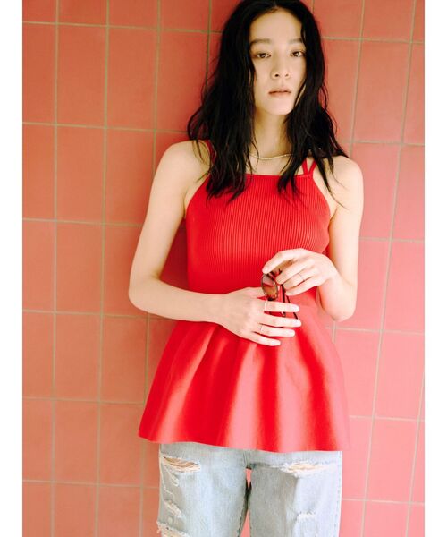 ペプラムシルエットが女性らしさを引き立てる1枚で主役トップスのニットキャミ ■デザイン 身頃はリブ編みですっきりと、ウエストからふんわりと広がる裾が女性らしいメリハリを演出します。 高めのウエスト位置が自然なスタイルアップ効果大です。 ホルターネックの紐は首の後ろで結んでも、チョーカーのように首に巻き付けるだけで垂らしても着ていただけます。 ■生地感 コットンポリエステルの程よいハリ感と清涼感を併せ持つニット素材は 立体的なペプラムシルエットを綺麗にキープしてくれています。 ■サイズ感 上半身は体のラインを拾いすぎない程よくフィットするサイズ感になっています。 ニットなので伸縮性が高くノンストレスで着用可能。 ■スタイリング フェミニンなシルエットのニットはダメージデニムでしっかりカジュアルダウンがお勧め。 女性らしさもありつつカジュアル感をしっかりMIXするのが今季のアングリッドらしいお勧めスタイリングです。 ・・・・・・・・・・・・・・・・・・・・・・ 透け感:なし 裏地:なし 伸縮性:なし 光沢感:なし 生地の厚さ:普通 ・・・・・・・・・・・・・・・・・・・・・・ ※商品画像はサンプルのため、色味やサイズ、素材の混率等の仕様に 変更がある場合がございます。予めご了承ください。 ※生地寄り画像を正規の商品の色味に近づけております。 ■商品のお気に入り登録 再入荷通知やラスト1点、お得なプライスダウンの情報も受け取ることができます。 ぜひご登録ください◎