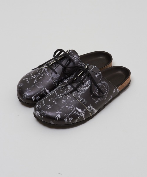 ポストマンシューズをイメージしたサンダル。 健康サンダル用のソールを使用しており、履きこむことによってコルクが沈み、使用者の足に馴染んでいきます。 アッパーにはISSUE#6の主題となった絵本の中の世界の情景を描き、プリントしたカウレザー。