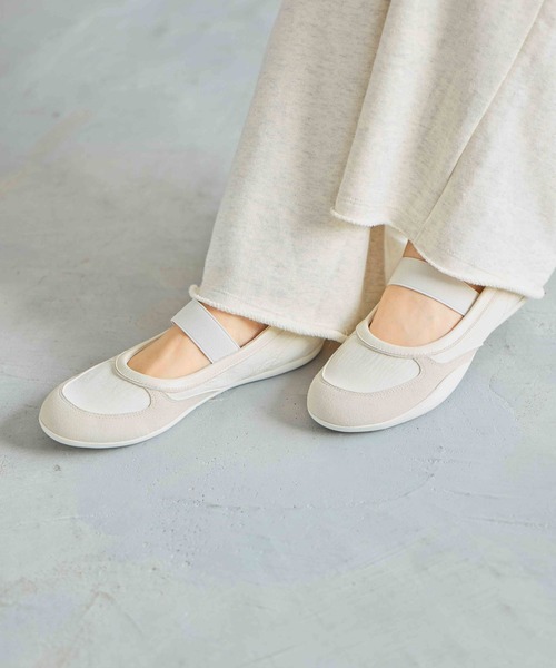 驚くほど軽く、歩きやすい!バレエシューズ感覚で履ける大人のコンビスニーカーーーー【素材】ナイロンや合成皮革の異素材を組み合わせました。【デザイン】スニーカーの歩きやすさと、バレエシューズのような女性らしいスッキリとしたフォルムを両立させました。甲部分には安定感を高めるベルトをほどこし、脱ぎ履きもスムーズで楽ちん!柔らかい履き心地で歩きやすく、軽量なのも嬉しいポイントです。ーーー【機能】1.つま先部分に消臭・抗菌防臭効果のあるテープを使用しています。2.クッション性のあるインソールを使用しています。3.甲材の一部にゴムを使用しているため、伸縮により脱ぎ履きしやすいです。4.かかとにクッションが入っているため、足あたりがやさしくフィット感がある仕様です。【スタイリング】デニムやスラックスなどのパンツスタイルとも相性抜群です。フェミニンなロングスカートやワンピースに合わせれば、程よい抜け感のある上品なカジュアルスタイルに。デイリーなお出かけから旅行まで幅広いシーンで活躍します。