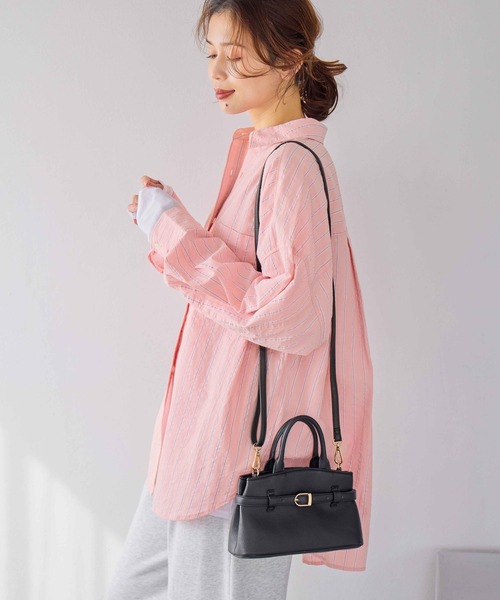 アクセサリー感覚で持てる! ミニサイズショルダー ーーー 【素材】 合成皮革とフェイクスウェードのアソート素材です。 【デザイン】 フロントにあしらわれたバックルベルトが、クラシカルで大人っぽい印象を与えます。 コンパクトながらも、スマホやちょっとした小物がすっぽりと入るサイズ感が魅力。 開口部は荷物の出し入れがしやすい形になっており、デイリーに使いやすい機能性も兼ね備えています。 定番のブラックやキャメルに加え、柔らかなグレージュ、差し色になるライトグリーンの4色展開です。 ーーー 【スタイリング】 小ぶりなサイズ感なので、コーディネートのワンポイントとしてアクセサリー感覚で取り入れるのがおすすめです。 ボリュームのあるニットやコートの上からでもバランス良く持て、セレモニーなどのきれいめなシーンにも活躍します。