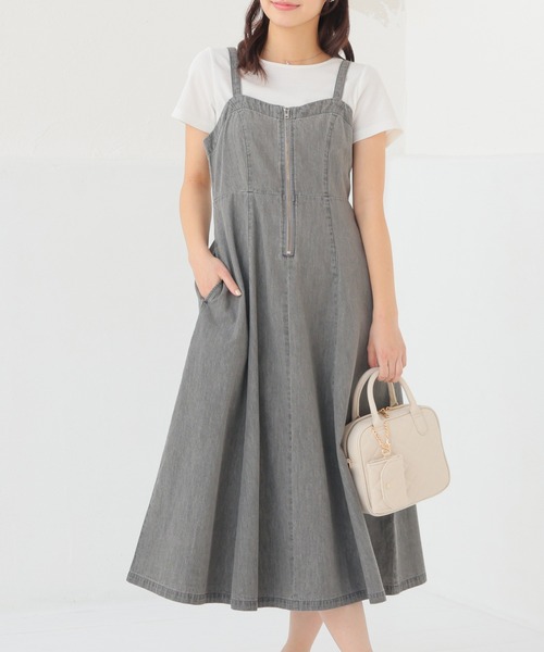 フロントジップで今っぽく 【デザイン】 トレンドライクなフロントジップがおしゃれなデザイン。 高めの切り替え位置から広がるAラインシルエットとロング丈で、スタイルアップ効果もあり大人っぽい雰囲気に。 肩ひもはアジャスター付きでお好みの丈に調節可能。 【素材・機能】 薄手で柔らかく快適な着心地の綿100%デニム素材。 便利な両サイドポケット付き。 【スタイル】 フェミニンなブラウスやカジュアルなTシャツなど、インナー次第で幅広い着回しに、ロングシーズン活躍。 ※後背・後ウエスト部分ゴム ●裏地/なし 品番:548-53-9419