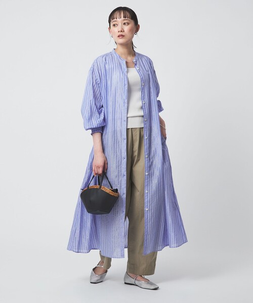 一枚で決まる、軽やかに揺れるシャツワンピース■デザイン羽織りとしてもワンピースとしても活躍する、軽やかなシャツワンピース。たっぷりとしたギャザーで泳ぐシルエットが美しいデザインです。首まわりはすっきりとしたバンドカラーで、上品な抜け感を演出。袖はまくりやすいよう、シャーリングゴムの仕様で仕上げました。■素材涼やかなボイル素材を使用。さりげないラメが入った印象的なストライプ柄で、コーディネートのアクセントに。■コーディネートデニムやワイドパンツと合わせたレイヤードスタイルで、こなれ感のある着こなしに。スニーカーを合わせてカジュアルに、フラットシューズやヒールできれいめにと、足元で印象が変わります。・生地が異なりますが、対象品番:36261000039と同デザインです。#春服,#夏服,#秋服============================裏地:なし透け感:あり光沢感:ありケア方法:手洗い可============================【注意事項】※商品に「取り扱い上の注意書き」、「洗濯表示」がございます場合は、使用前に必ずご確認ください。※商品画像は、光の当たり具合やパソコンなどの閲覧環境により、実際の色味と異なって見える場合がございます。あらかじめご了承ください。※商品の色味の目安は、商品単体の画像をご参照ください。店舗へお問い合わせの際は、全国のgreen label relaxing各店舗まで下記の品名/品番をお申し付けください。品名:CFC ギャザー SHOP 品番:36261000028