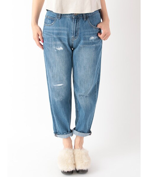 クラッシュとダメージ加工でボーイズライクに仕上げた10ozデニムパンツ。少しゆったりしたサイズ感が◎。シンプルなトップスとのコーデに映え、今年らしくフリンジアイテムとも相性良いです。。※後ろウエストにゴムが入ります。前後にブラスト、前身にヒゲ入ります。
