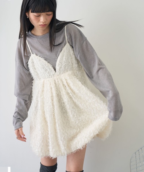 繊細なペタルシャギーのフリルと立体感のあるバルーンシルエットがフェミニンに 柔らかなニュアンスを演出してくれる華やかなバルーンミニキャミワンピース トップスを重ねたり、デニムにも合う存在感抜群な一着 ◇DESIGN ・裾にたっぷりとボリュームを持たせたバルーン仕様が、歩くたびに空気を孕み、ふんわりとした立体感を実現するドラマティックなワンピース ・存在感のある素材を使いつつも、華奢な肩紐とVカットの胸元デザインですっきりと洗練された印象に。 ・異なる質感の毛足をミックスすることでワントーンながら奥行きのあるコーデに◎ ・特別な日のパーティーシーンからデイリーのレイヤードスタイルまで。 ・肩ひもはアジャスター付きで、着丈やレイヤードの深さを調節できるのもポイント。 ◇FABRIC ・ボリューム感のある見た目以上に軽やかな素材感を採用し、長時間の着用でも疲れにくいのが特徴。 ・胸元はシャープなVカットデザインに。顔周りをすっきりと見せ、甘くなりすぎない大人の可愛さを演出してくれます。 ◇STYLING ・春先や秋口には、タイトなシアートップスやタートルネックニットをインナーに合わせたレイヤードスタイルがおすすめ。 ・デニムパンツやバイカーショーツをレイヤードしたり、重めのブーツを合わせることでトレンド感のある甘さを抑えたモードな着こなしに仕上がります。 ・ジャケットやニットをレイヤードし、ミニスカートとして、裾から覗かせる大人のリラックススタイルにもおすすめです。 ・ 一枚でさらりと着用し、大ぶりのアクセサリーを添えればパーティーや二次会などのオケージョンシーンにも最適。 【NOGLE/ノグル】 上品さと遊び心をもちながら、 変わらずに心地よく着続けられるもの。 ■公式インスタグラム @nogle_official ★商品のお気に入り登録→【カートに入れる】右側のハートマークをクリック 完売カラーの再入荷通知や、ラスト1点の通知、セールの通知も受け取ることができます。 ※店頭及び屋外での撮影画像は、光の当たり具合で色味が違って見える場合があります。またご覧いただきますモニターや使用環境により実際の商品と多少色味が異なって表示される場合がございます。 予めご了承をお願いいたします。