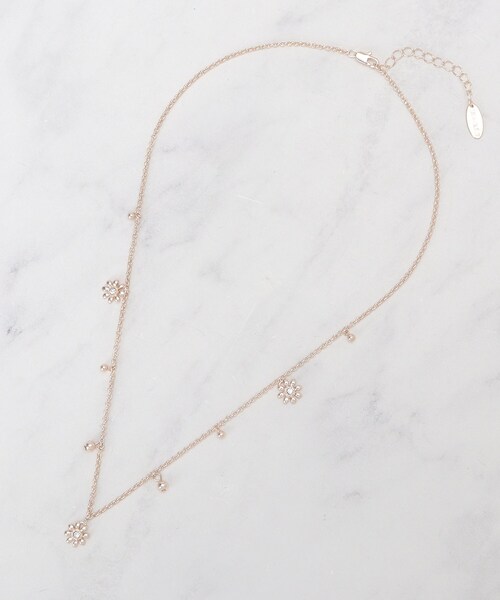 【デザイン】 細めのチェーンに、等間隔に配した小粒メタルビーズとフラワーモチーフのチャームがさりげないリズムを生むネックレスです。 フラワーチャームは小さなクリスタルや立体的な花弁で繊細な煌めきを演出し、アジャスターで長さ調整が可能。 単品で上品に顔まわりを彩るほか、他のネックレスとのレイヤードにも馴染むデザインです。 【コーディネート】 上品なデザインなのでオンからオフまで幅広いニーズに活躍できるかと思います。 【おすすめポイント】 スライドパーツでお好みのバランスに調整可能。 【カラー】 005 ピンクシルバーカラーメッキ 006 シルバーカラーメッキ 007 ゴールドカラーメッキ ※照明の関係により、実際よりも色味が違って見える場合があります。また、パソコン・スマートフォンなどの環境により、若干製品と画像のカラーが異なる場合もございます。 店舗へのお問い合わせ商品番号:C70-85019 ●製品寸法: 00:全長49cm モチーフH1cm モチーフW0.9cm 備考: