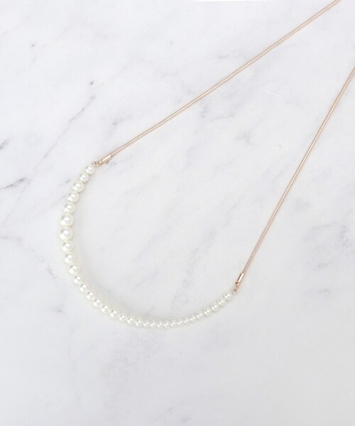 【デザイン】 フェイクパールの連なりと細めのメタルチェーンを組み合わせたコンビネーションネックレス。 片側に並んだフェイクパールが顔まわりに柔らかなフェミニンさをプラスし、スライドで長さ調整できるノットが縦ラインを自在に演出します。 控えめで上品な佇まいはオフィスからカジュアルまで幅広く馴染む汎用性の高いデザインです。 【コーディネート】 上品なデザインなのでオンからオフまで幅広いニーズに活躍できるかと思います。 【おすすめポイント】 スライドパーツでお好みのバランスに調整可能。 【カラー】 005 ピンクシルバーカラーメッキ 006 シルバーカラーメッキ 007 ゴールドカラーメッキ ※照明の関係により、実際よりも色味が違って見える場合があります。また、パソコン・スマートフォンなどの環境により、若干製品と画像のカラーが異なる場合もございます。 店舗へのお問い合わせ商品番号:C70-85022 ●製品寸法: 00:全長83.5cm モチーフ直径0.7cm 備考: