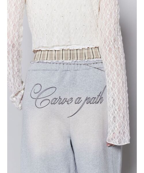 ウエストのレイヤードデザインがポイント ■デザイン ウエストのレイヤードデザインが目を惹くスウェットパンツです。 レイヤード部分にはチェック生地を使用し、カジュアルな中に程よいアクセントを加えました。 パンツ部分に加工を施し、表情のある仕上がりがスタイリングに奥行きをプラスします。 ヒップ部分にはロゴをプリントし、バックスタイルまでデザイン性を感じられます。 ■スタイリング デザイン性のあるボトムなので、ベーシックなトップスと合わせるだけで今季らしいスタイリングに仕上がります。 足元は厚底サンダルやスニーカーはもちろん、 今季はレースアップヒールスニーカーと合わせるバランスがおすすめです。 ※着用画像はフラッシュの加減で実際の製品と色味等が異なる場合がございますので、生地のズームアップ画像をご確認ください。 ※ご利用の端末画面の設定により実際の商品と色味が異なる場合がございます。 【商品特徴】 透け感:なし 伸縮性:なし 生地の厚さ:普通 サイズ感:普通 裏地:なし ポケット:あり