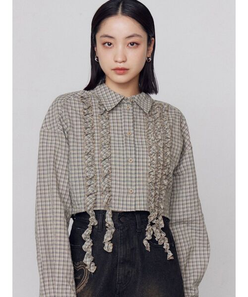 トレンド感のあるワイドクロップドシャツ ■デザイン 共地のテープフリルがポイントのワイドクロップドシャツです。 アシンメトリーに施したフリルディテールがシンプルながらも存在感のある一枚に仕上げています。 柔らかな素材を使用し、立体的なデザインでも着心地は軽やかです。 ワイドなシルエットとクロップドのバランスが、スタイリングに抜け感とモードな印象をプラスします。 ■スタイリング 印象的なシャツトップスなので、 デニムマイクロスカートのようなベーシックなボトムがおすすめ。 ショート丈なので、レースグラフィックルーズデニムのようなワイドデニムでもバランスよく着用していただけます。 ※着用画像はフラッシュの加減で実際の製品と色味等が異なる場合がございますので、生地のズームアップ画像をご確認ください。 ※ご利用の端末画面の設定により実際の商品と色味が異なる場合がございます。 【商品特徴】 透け感:なし 伸縮性:なし 生地の厚さ:普通 サイズ感:普通 裏地:なし ポケット:なし
