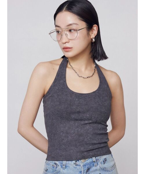テレコ素材のホルターネックタンクトップ■デザインタイトなシルエットで作成しています。着丈はウエスト位にしているのでどんなボトムにも合わせやすいです。カップ付きなのがうれしいポイント。ブラックは加工なし、グレー・ブラウンはピグメント加工でこなれ感を演出しています。■スタイリングルーズネックストリングTシャツのインナーとして合わせるスタイリングがイチオシ。マットな素材でリブの表面感があるので下着っぽい印象に見えず、一枚着としても着用可能です。※着用画像はフラッシュの加減で実際の製品と色味等が異なる場合がございますので、生地のズームアップ画像をご確認ください。※ご利用の端末画面の設定により実際の商品と色味が異なる場合がございます。【商品特徴】透け感:なし伸縮性:ややあり生地の厚さ:普通サイズ感:普通裏地:なしポケット:なし