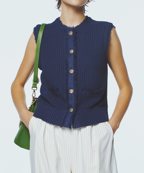 *コットンライクポリーコットンのようなナチュラルな風合いが魅力の、コットンライクポリー素材を使用したニットジレ。縁取りのフリンジトリミングがさりげないアクセントとなり、上品な華やかさをプラスします。レイヤードしやすいシルエットで、シャツに重ねるだけで旬のスタイルが完成。コーディネートに奥行きを与え、きれいめからカジュアルまで幅広く活躍する一枚です。 洗濯:洗濯機使用可能(ネット使用) ■ Styling シンプルなTシャツやデニムに合わせれば、一気に洗練されたアーバンスタイルへ昇華。 ブラウスやシアートップスと重ねれば、奥行きのある上品なフェミニンスタイルが完成します。 程よい丈感は、細身のパンツからボリュームのあるフレアスカートまで、合わせるボトムを選ばないのも魅力。 絶妙なバランスで、オンオフ問わずあなたの個性を美しく引き立ててくれる主役級アイテムです。 《お気に入り登録》はお得がいっぱい! 「商品」のお気に入り登録で、再入荷、ラスト1点、セールなどお得な通知を受け取ることができます。 「ブランド」のお気に入り登録で、新商品や再入荷などいち早くブランドの情報を受け取ることができます。 是非、この機会にご登録くださいませ。