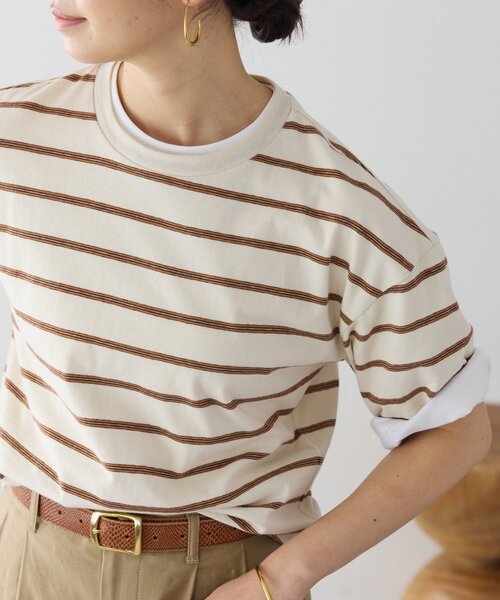 毎日に寄り添う、大人のためのボーダーTシャツ ●デザイン ・スラブ入りのラフな素材感のマルチボーダーでお作りしたクルーネックTシャツ。 ・綿100%の柔らかなタッチで心地良い素材感。 ・ボディはゆったり、裾はフィットさせてメリハリを効かせたデザイン。 ウエストインしなくても決まりが良く、腰まわりにクシュッとしたニュアンスを付けて着こなしていただけます。 ・敢えて太く作ったスリーブでエフォートレスなムードもプラスした、大人のボーダーTシャツです。 ・素材違いの無地でお作りしたゴブソデクルーネックTee(RDZ1061206A0005)との重ね着もおすすめ。 袖口をロールアップすればトレンドのスタイルを楽しんでいただけます。 ※素材違いのゴブソデクルーネックTee(RDZ1061206A0005)もございます。 ●素材 綿 100% ・スラブ入りのラフな素材感のマルチボーダー ・薄手で透けにくく、柔らかな風合い。 洗濯方法:洗濯機弱洗い可(湯温30度まで) 透け感:なし 裏地:なし 伸縮性:あり 生地の厚さ:- 光沢:なし -------------------------------------------------------------------------------- 【お買い物をもっと便利に楽しく♪】 『♡』をクリックでお気に入り登録 ✓「商品のお気に入り登録」で・・・ ラスト1点や再入荷の通知が届きます。登録して頂いた商品だけが対象となる、あなただけのタイムセールが開催されることも! ✓「ブランドのお気に入り登録」で・・・ 新商品や再入荷など、いち早くブランドのお得な情報を 受け取ることができますので、ご登録をおすすめします! -------------------------------------------------------------------------------- 【注意点】 ※画像の商品は光の照射や角度、お使いのモニター環境により、 実物と色味が異なる場合がございます。 ※入荷状況により、お届け予定が前後する場合があります。 ※お客様への発送が店頭販売より遅れる場合もあります。 ※追加生産商品は、一部の店舗、通販で販売中の場合がございます。 予めご了承下さい。 ----------------------------------------------------------------------