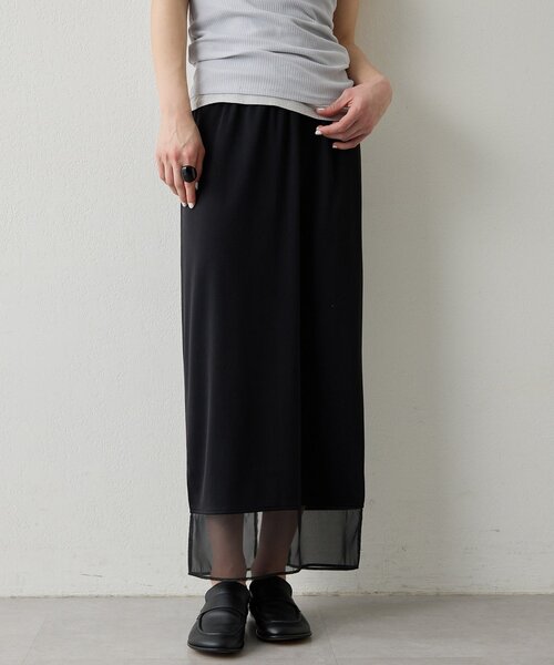 【2026SS】 足元に抜け感が生まれる、楽ちんシアー切り替えスカート ■裾をシアーなチュール素材で切り替えたタイトスカート。 ■ストレッチの効いたカットソー素材+ウエストゴム仕様が着心地の良い一枚。 ■タイト過ぎないサイズ感ながら、Iラインシルエットですっきりとした印象に。 ■つるっとした滑らかな肌触りと、きれいめな見え感もポイント。 ■深めのバックスリットがさらに軽やかさをプラスし、 抜け感のあるコーディネートに導いてくれるアイテム。 【COLOR】 オフホワイト:明るく優しいカラーが女性らしいオフホワイト。 ブラック:様々なシーンに馴染むきれいめなブラック。 【STAFF COMMENT】 ■身長160cm|普段サイズ M~L|着用サイズ F すっきりとした見え感ながら、腰回りやヒップをカバーできる程よいシルエットで、タイトスカートが苦手な方にもおすすめなデザインです! ウエストゴム+ストレッチの効いた素材使いでとても楽に着用いただけます。シンプルで合わせるアイテムを選ばず、シーズンレスに着回しの効くアイテムです! ■身長167cm|普段サイズ M~L|着用サイズ F 柔らかく落ち感のあるジャージー素材のロングスカート。裾の切り替え部分は透け感があり、ロング丈でも重たく見えないのが◎ウエストはギャザーになっており、腰ハリの私でもピタっとなりすぎないのが嬉しいポイントでした!! ---------------------------------------------------- 洗濯方法:手洗い可 透け感:裾のみあり 裏地:なし 伸縮性:あり 光沢感:なし ---------------------------------------------------- ― THE PAUSE(ザ ポーズ) ― 流行を自分らしい発想で切り取ってコーディネートを遊ぶ。 色のグラデーション、ヴィンテージ感漂うワークアイテム・・・ ギャラリーのようなクローゼットの中から 組み合わせをデザインするようにファッションを楽しむ。 そんな、自由なライフスタイルをもつ大人の女性にむけて 新しい感覚のカジュアルスタイルを提案します。 【注意事項】 ・画像の商品はサンプルです。実際の商品と仕様、加工が若干異なる場合があります。 また 、パソコンやスマートフォンのモニター環境などにより、色味が違って見える場合があります。 ・店頭及び屋外での撮影画像は、光の当たり具合で色味が違って見える場合があります。 商品の色味は、スタジオ撮影の画像をご参照ください。 ・入荷状況により、お届け予定が前後する場合があります。 ・お客様への発送が店頭販売より遅れる場合があります。 ・追加生産商品は、一部の店舗、通販で販売中の場合があります。 予めご了承下さい。 【気になるアイテムは、「お気に入り」登録を】 ハートマークをクリックしておくことで、スムーズにお買い物が楽しめます。 ・ラスト一点のお知らせ ・再入荷のお知らせ ・SALEのご案内