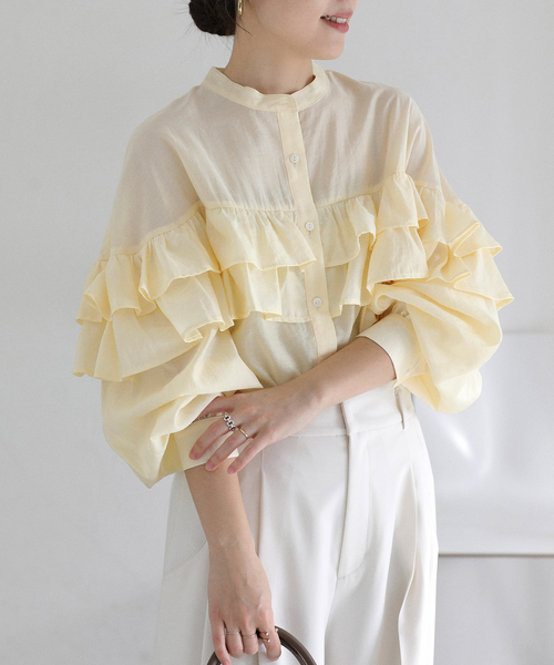 【2026SS】 LaTotalite 贅沢なフリルが目を惹く主役級ブラウス。 胸元から袖にかけて重なるダブルフリルが華やかな印象を演出します。 甘さのあるデザインながら、バンドカラーですっきりと仕上げているので大人っぽく着こなせる一枚。 ほんのり透け感のある軽やかな素材で1枚着はもちろん、ジャケットインにも映える存在感。 デニムでカジュアルに、きれいめボトムと合わせてお仕事やお出かけにも活躍する、着回し力の高いブラウスです。 ********************** 透け感:あり 裏地:なし 伸縮性:なし 光沢感:なし 生地の厚さ:普通 ********************** 【スタッフ着用コメント】 《スタッフ名:mizuki》 身長:160cm/体型:普通/普段サイズ:S~M/着用サイズ:フリー サイズ感:ゆとりのあるサイズ感。裾をインしたり、袖をまくったときに適度なボリューム感が作れます。 素材感:ほんのり透け感のある柔らかな素材。 着心地:柔らかく軽やかな質感でストレスフリーな着心地。 ********************** ※取り扱いについては、商品についている品質表示でご確認ください。 ※照明の関係により、実際よりも色味が違って見える場合があります。 またパソコン・スマートフォンなどの環境により、若干製品と画像のカラーが異なる場合もございます。 ※商品の色味は、商品アップ画像をご参照ください。 着用モデル身長: 160cm 着用サイズ:フリー 本体:手洗い可能