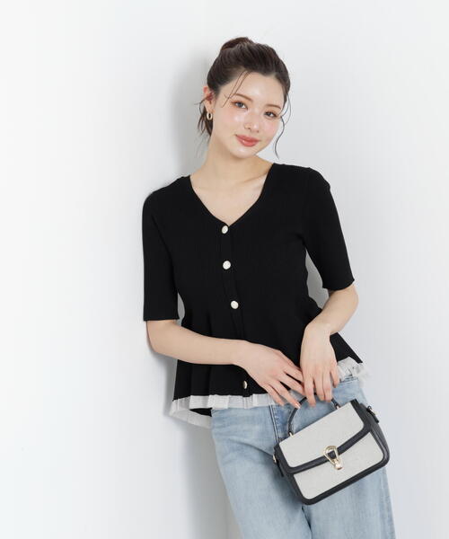 大人気アイテムが半袖になって登場!フロントの飾りボタンがポイントの半袖ペプラムニット。胸元までフィットし、ボリュームのあるペプラムシルエットが女性らしいラインを演出します。裾は前後差をだした着丈にし、気になる腰まわりをカバーしながら着やすさも両立。これからの季節にぴったりなカラーを揃えており、とくに黒×オフカラーの配色が目を引きおすすめです。<素材>もっちりした糸とシアー糸を使用しています。<詳細>仕様・開閉なし裏地・なし透け感・裾のみあり / 光沢・なし / 伸縮性・あり生地の厚さ・普通★オフィシャルサイト・ZOZOTOWN・一部店舗でしか買えない限定商品★限定カラー:ホワイト・グレー※モデルの着用画像の場合、光の当たり具合により、実際の色味と異なって見えることがございます。色味は、商品単体の画像をご参照ください。