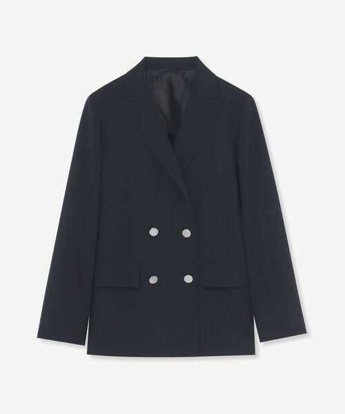 【着用推奨シーズン:春・秋・冬】 <素材説明> 繊細な梳毛糸を使用し、薄手で軽量なサマーウール素材です。肌触り良くソフトな風合いが特徴です。 <デザインポイント> メンズ由来のピークドラペルでシャープな衿と、前振りの袖のジャケットです。裏地は背抜き仕様で長いシーズン活躍します。シルバーのメタル釦が爽やかでクリーンな印象です。