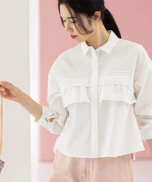 フロントのタックとさりげないフリルで品良く華やぐ、 羽織りとしても活躍するデザインシャツ 【デザイン】 ・フロントに細かいタックとフリルをあしらい、華やかに仕上げたデザインシャツ ・やや短めの着丈でインしなくてもバランスがとりやすく、羽織りとしても活躍 ・無地とストライプの全4色展開で、きれいめにもカジュアルにも合わせやすいシンプルな形がポイントです。 【素材】 ・ポリエステル/コットンのシャツ素材を使用しており、程よいハリ感がポイント ・マシンウォッシャブルでご自宅でのお洗濯が可能。 ※照明の関係により、実際よりも色味が違って見える場合があります。また、パソコン・スマートフォンなどの環境により、若干製品と画像のカラーが異なる場合もございます。 モデル情報:身長163cm B82 W62 H91 着用サイズ:38(M) 店舗へのお問い合わせ商品番号:637-85062 ●製品寸法: 38(M):着丈54cm B104cm 袖丈49cm 肩幅56cm 40(L):着丈55cm B108cm 袖丈50cm 肩幅57cm 42(LL):着丈57cm B112cm 袖丈52cm 肩幅58cm 備考:
