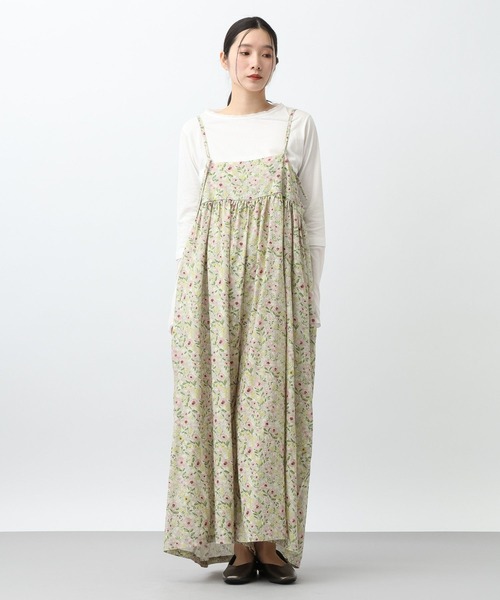 春のスタイリングの主役にぴったりな一着オリジナルの花柄が目をひくキャミサロペットーーー【素材】しなやかで落ち感のあるテンセルリネン生地を使用。オリジナルの花柄をプリントしています。【デザイン】春らしいカラーリングのキャミサロペット。オリジナルの花柄が目をひくデザインが春のスタイリングの主役におすすめです。パンツ部分はワイドなので、ワンピースにも見えるゆったりとしたシルエットも特徴的。バスト周りにゆとりを入れたデザインになっており、後ろリボンでご調節いただけます。肩紐も前で結ぶことで長さを調節できるので、幅広い身長の方にご着用いただる一着です。ーーー【スタイリング】サロペットを主役に、シンプルなブラウスやカットソーを合わせた着こなしがおすすめ◎夏場も着用できるので、タンクトップやキャミソールを合わせたヘルシーな着こなしも素敵です。