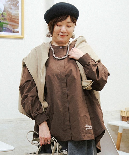studio CLIPの人気スタッフ『さかもってぃ』企画!体型カバーが叶うノーカラーシャツーーー【素材】オフホワイト・ピンク・ブラウンはハリのある綿素材を使用。インディゴは綿リヨセルのデニム素材を使用しています。【デザイン】程よくゆとりのあるチュニックシャツ。気になるヒップ周りがすっぽりと隠れ、体型カバーが叶う一枚。スッキリとしたノーカラーの衿ぐり、袖口はリブ仕様で、デザインと機能性の両方を詰め込みました◎オリジナルの配色釦や、裾に入ったさかもってぃ考案の”Always on your side.”のメッセージ刺繍もこだわりポイントです。ーーー【スタイリング】パンツ合わせで大人カジュアルに、スカート合わせで綺麗めに。ベストやビスチェをレイヤードしても素敵です。さかもってぃコメント▼シワになりにくい生地を使用したノーカラーシャツです。ゆったり着用できて、袖口はリブ仕様なので捲りやすいのもポイント。首元のボタンはアクセサリーを付けなくても可愛く見えるように、配色の糸とボタンを使用しています。裾のロゴは『Always on your side』(いつもあなたの味方)