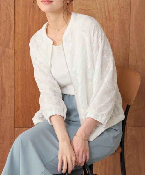 羽織るだけでお洒落を格上げ 【デザイン】 繊細な総レースの上品な透け感が華やかで大人なデザイン。 丸みのあるシルエットとふんわり袖でさらにフェミニンに。 ゆったりした幅と腰にかかる丈感。 ロングシーズン使える8分袖。 【素材・機能】 チュール刺繍レースとシフォンの二枚仕立て。 【スタイル】 パンツ合わせのカジュアルにも、ワンピースやロングスカート合わせの甘めスタイルにも、幅広く活躍。 いつものコーデにさっと羽織るだけで、華やかなトレンドスタイルに。 ※8分袖 ※袖口・裾部分ゴム ※二枚仕立て 品番:534-42-8539